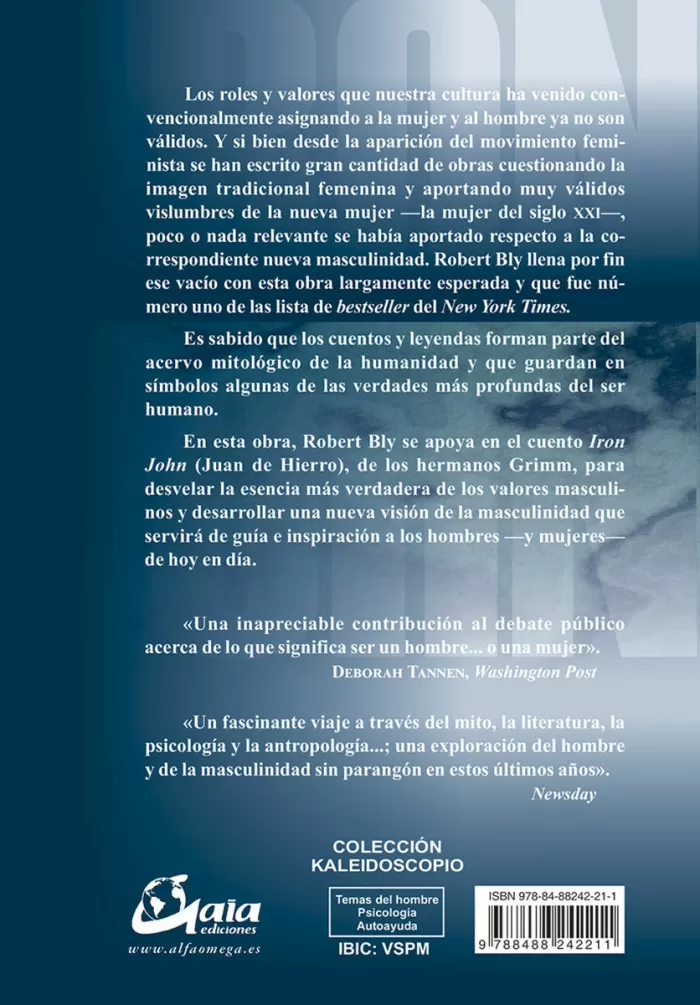 Los roles y valores que nuestra cultura ha venido convencionalmente asignando a la mujer y al hombre ya no son válidos. Y si bien desde la aparición del movimiento feminista se han escrito gran cantidad de obras cuestionando la imagen tradicional femenina y aportando muy válidas vislumbres de la nueva mujer -la mujer del siglo XXI-, poco o nada relevante se había aportado respecto a la correspondiente nueva masculinidad. Robert Bly llena por fin ese vacío con esta obra largamente esperada y que fue número uno de las listas de bestseller del New York Times.
