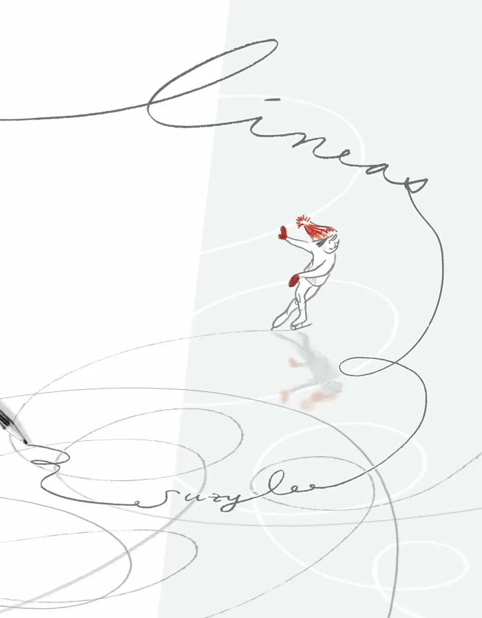 Un artista dibuja una línea con su lápiz, los patines de una niña siguen esta línea. De repente, estamos ante un estanque congelado. Página tras página, nos deslizamos siguiendo el movimiento que crea el baile de la niña sobre el hielo. Sin embargo, una caída inesperada, nos obliga a preguntarnos: ¿qué es real y qué es fantasía en esta historia?