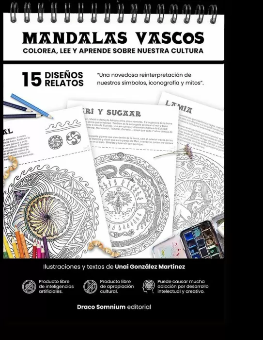El primer libro de colorear mandalas vascos del mundo, fundamentado en estudios de iconografía vasca, estelas discoidales de la edad de piedra y antiguos mitos paganos.